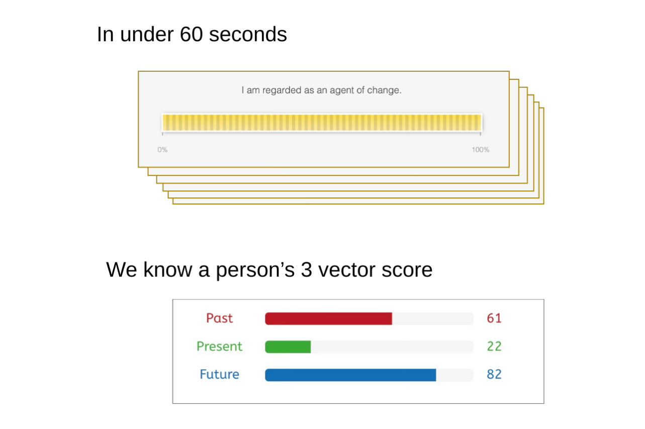 Using just three carefully designed vectors, MindTime captures a person’s cognitive pattern with reliable accuracy in under 60 seconds. This method provides high-fidelity, first-party insight without relying on behavioral inference or personal tracking.